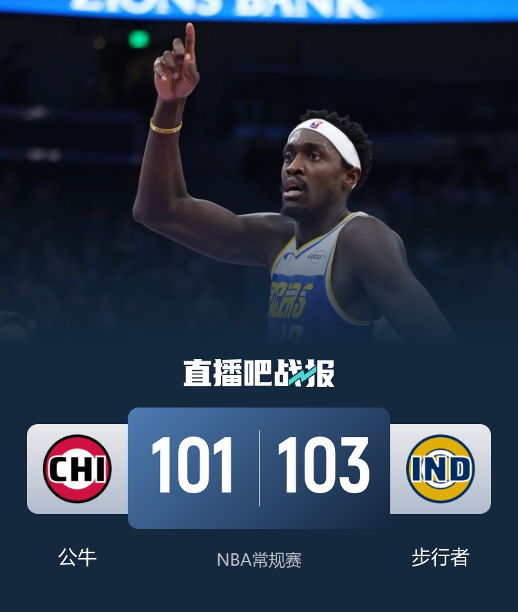 开场后赫夫手感火热在半节时间里5投5中独得14分帮助步行者取得领先,吉迪内突外投帮助公牛咬住比分,随后进入轮换阵容公牛掀起攻势完成反超。第二节两队又是轮番打出攻势,步行者上来率先打出12-0攻势一度领先到10分,但公牛立马又回应一波11-0的反扑,西亚卡姆帮助球队再度拉开比分。易边再战,公牛上来又是连得9分将比分追平,此后两队打得十分胶着。步行者第四节上来又进攻断电,公牛半节打出15-2反超比分,步行者及时调整通过防守反击连得8分夺回反超。随后两队胶着到最后,赫夫连续两次单防建功,西亚卡姆单打吉迪得手,公牛时间不够只得采用犯规战术,内姆哈德两罚一中,琼斯突破上篮被赫夫干扰球,西亚卡姆中投绝杀,最终步行者103-101送公牛3连败。